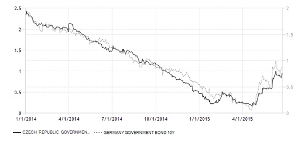 Ten ukazuje vývoj výnosů českých a německých desetiletých státních dluhopisů a je více než vypovídající. Zatímco si Česká republika ještě před rokem půjčovala za cca. 2,5 % úroku, aktuálně si půjčujeme za hodnotu mnohem nižší. Ceny dluhopisů jsou tak skutečně vysoko a další prostor k jejich růstu je omezený. Zatímco u akcií mohou volné peníze vhozené centrálními bankami na trh vyhnat ceny prakticky kamkoli, u dluhopisů tomu brání logická bariéra. Ta zafungovala v průběhu druhého čtvrtletí poměrně spolehlivě. Výnos německých dluhopisů klesl tak nízko, že při započtení inflace kupci nových dluhopisů Německu reálně platili peníze za to, že mu mohou půjčovat. I současná situace, kdy při inflaci 0,7 % činí výnos českých desetiletých dluhopisů 0,85 %, naznačuje, že ceny jsou vysoké.