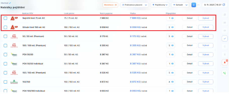 - 3 limity pro povinné ručení (75 mil. Kč, 150 mil. Kč a 250 mil. Kč)