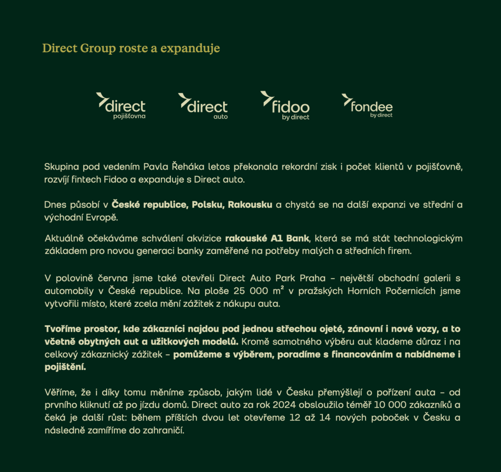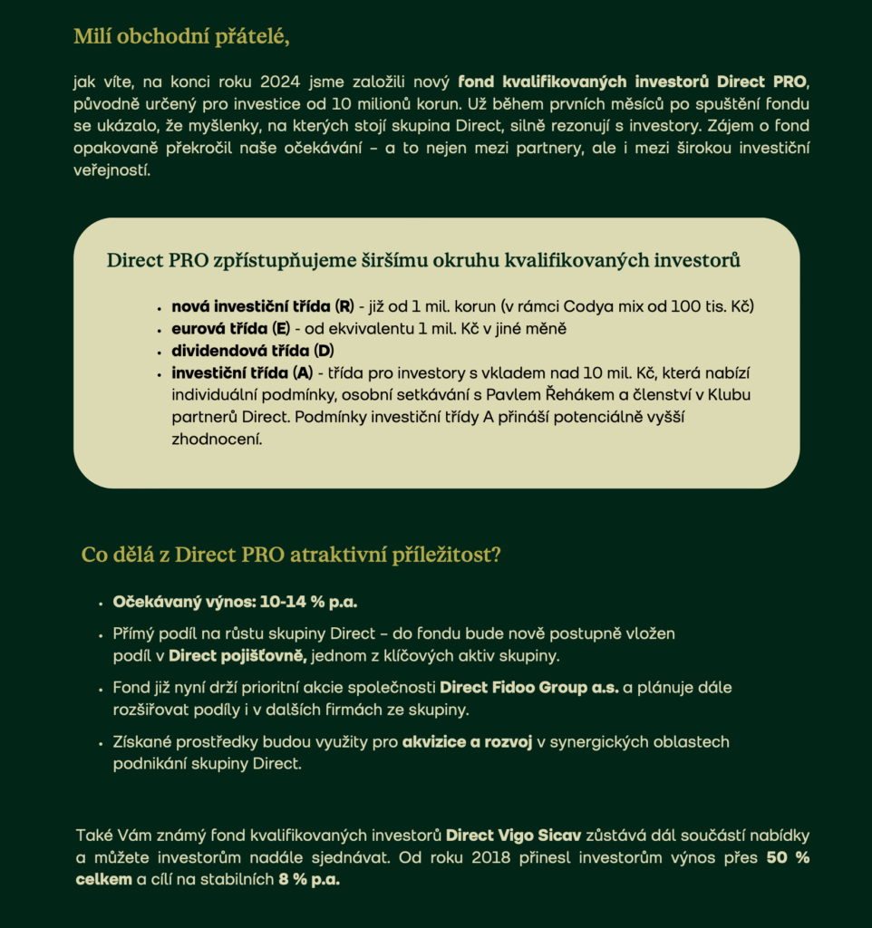 Na konci roku 2024 byl založen fond kvalifikovaných investorů Direct PRO, původně určený pro investice od 10 milionů korun. Už během prvních měsíců po spuštění fondu se ukázalo, že myšlenky, na kterých stojí skupina Direct, silně rezonují s investory. Fond zaujal širokou veřejnost – nejen poradce, ale i koncové klienty.