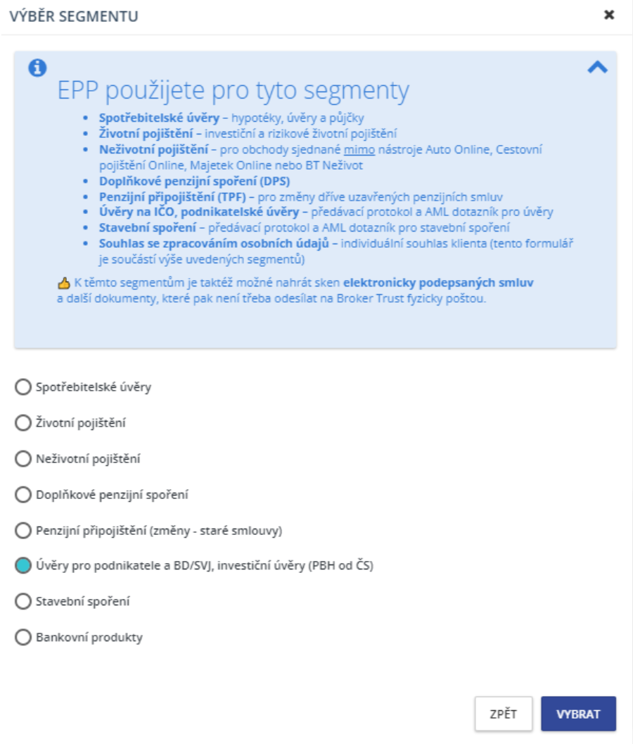 Vyberete nebo zadáte klienta s RČ a v nabídce segmentů zvolíte novou kategorii „Úvěry pro podnikatele a BD/SVJ, investiční úvěry (PBH od ČS)“.